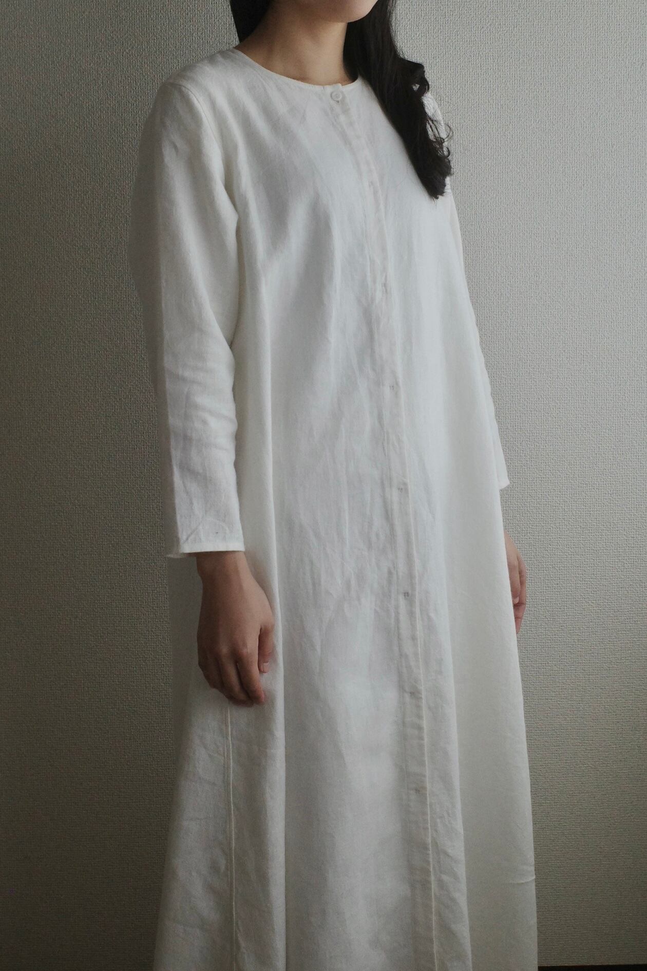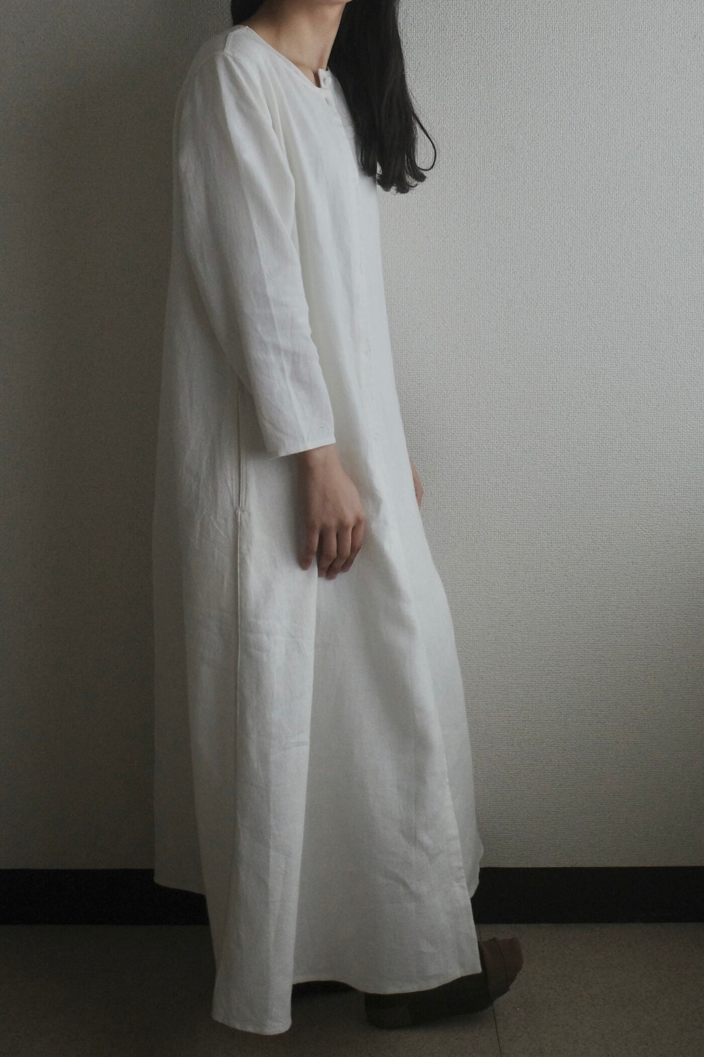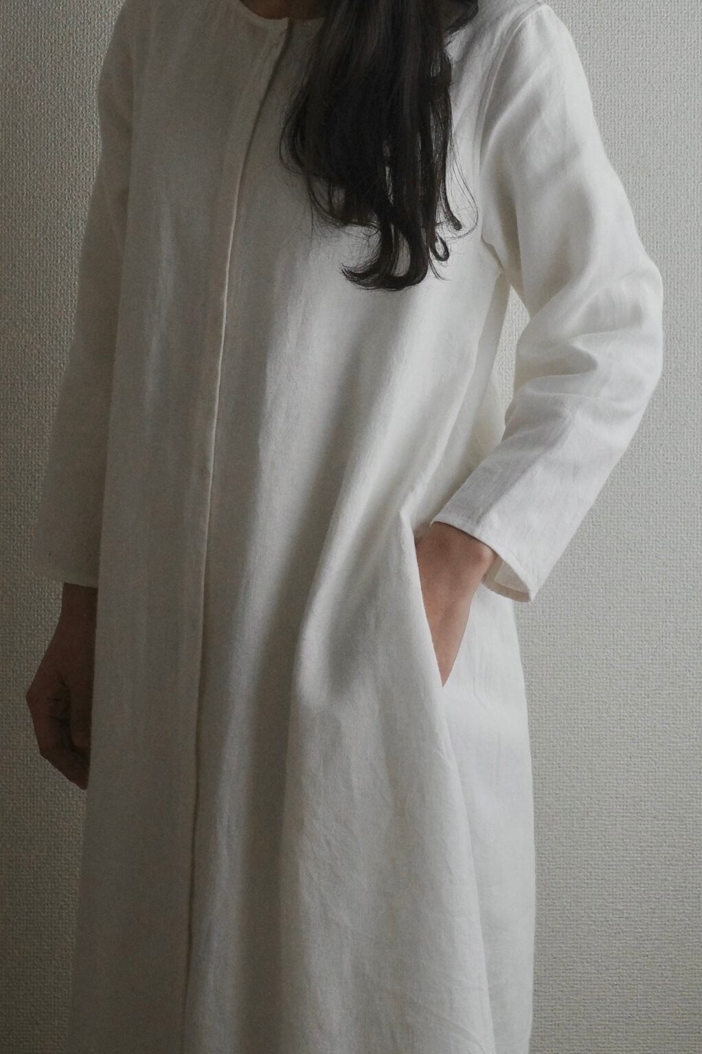 やや厚みがあり、やわらかな質感のラミーとリネンの糸で織られた生地で仕立てたワンピース。