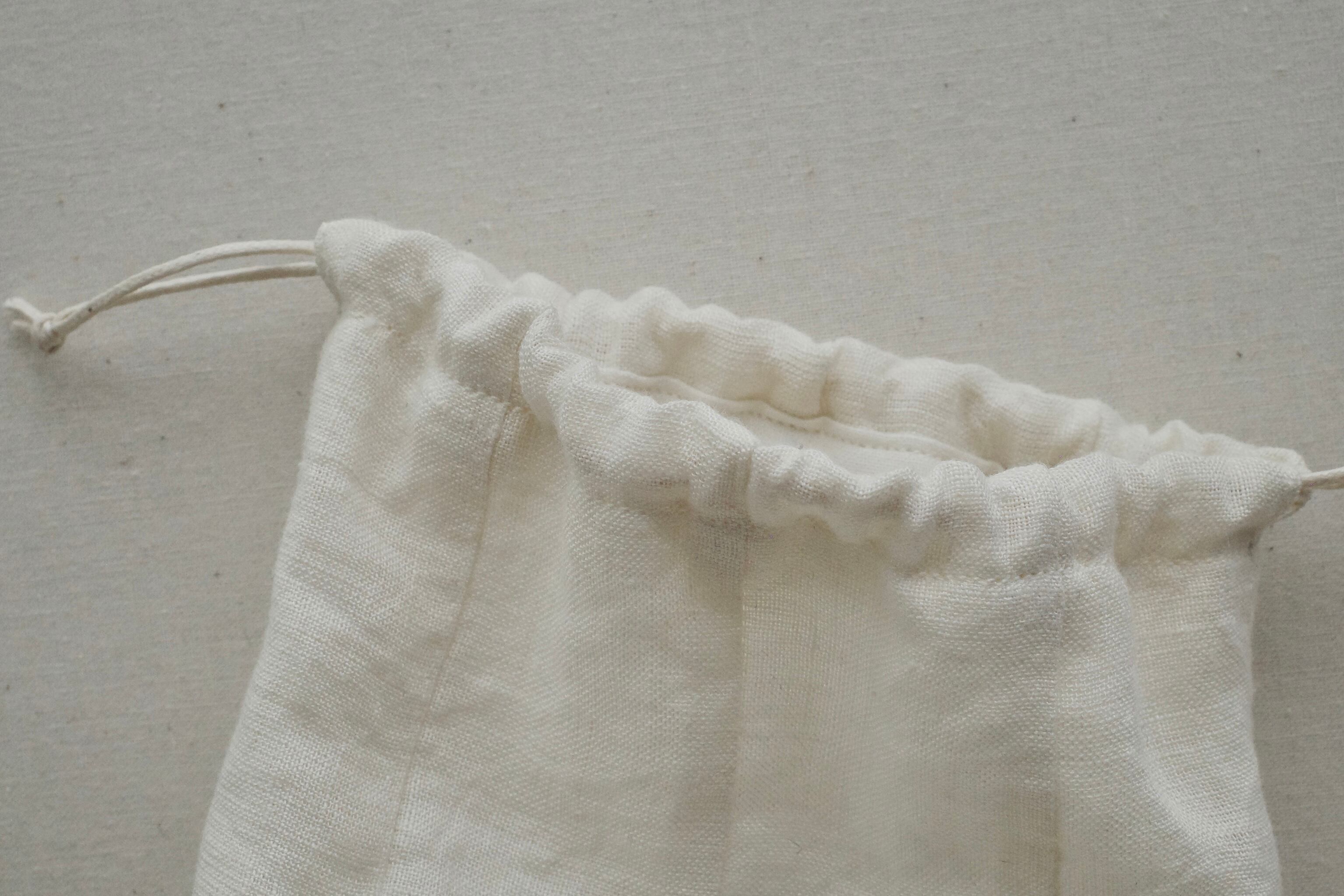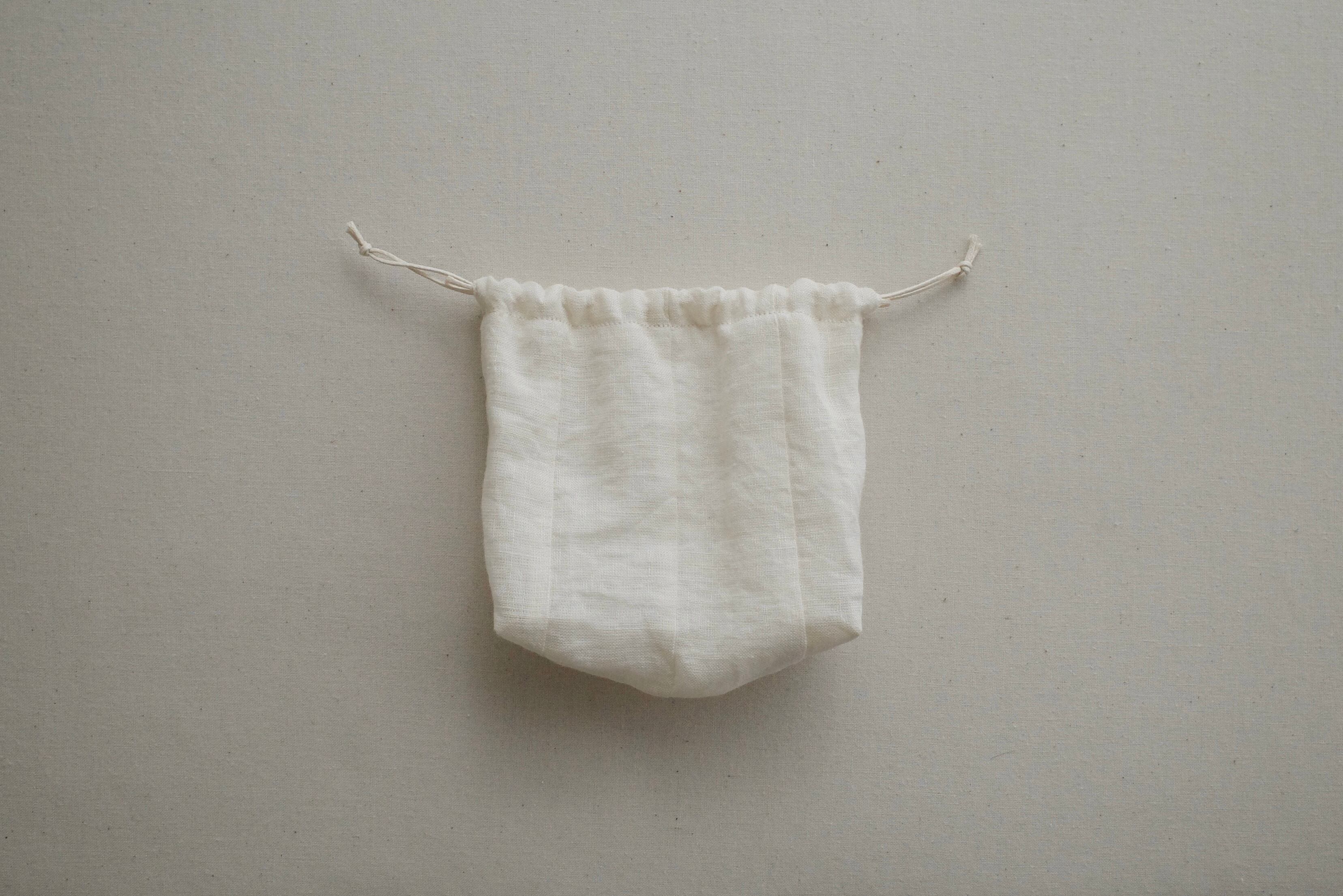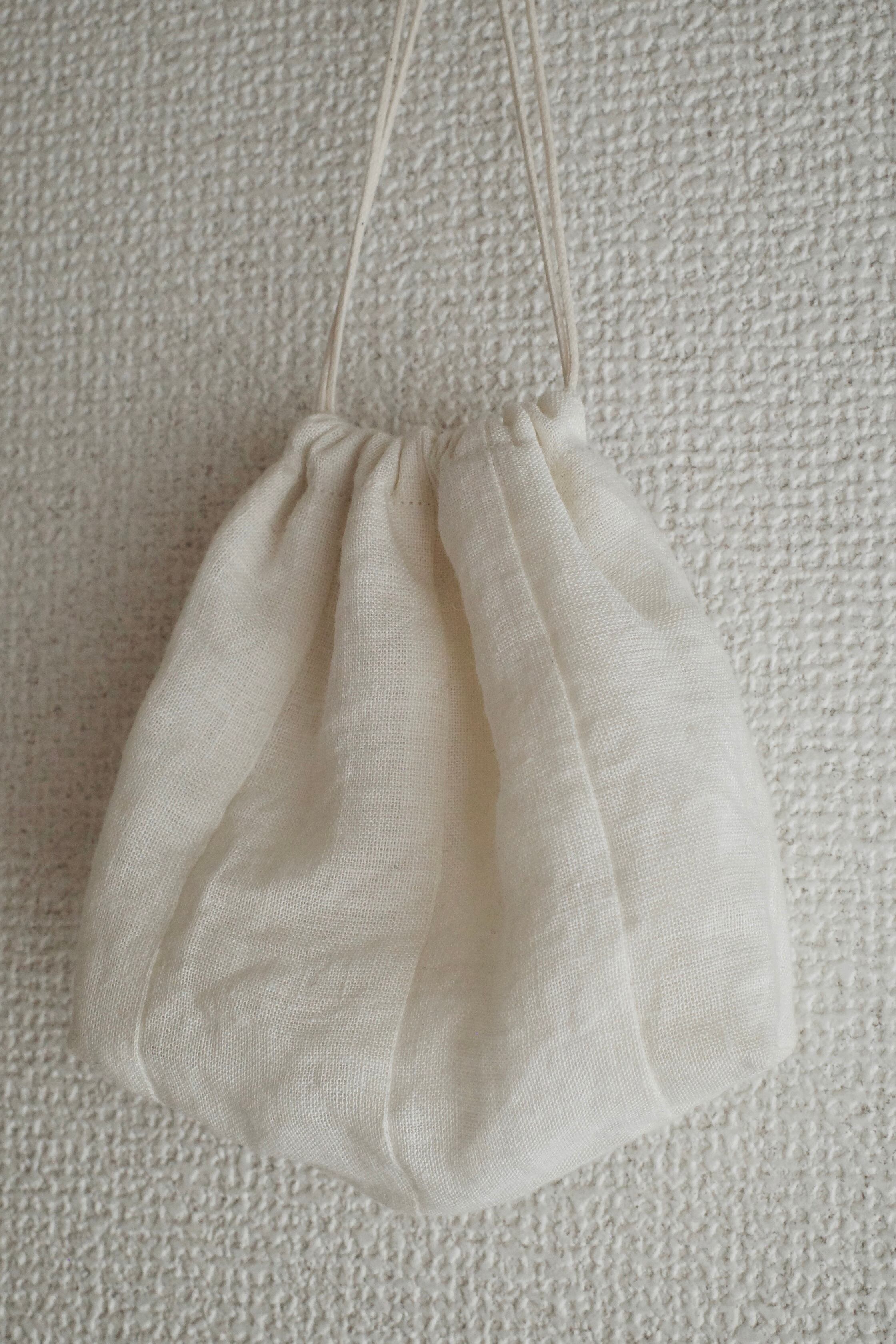 表布はリネンの生地、裏布と紐は綿の素材を使った二重の巾着です。