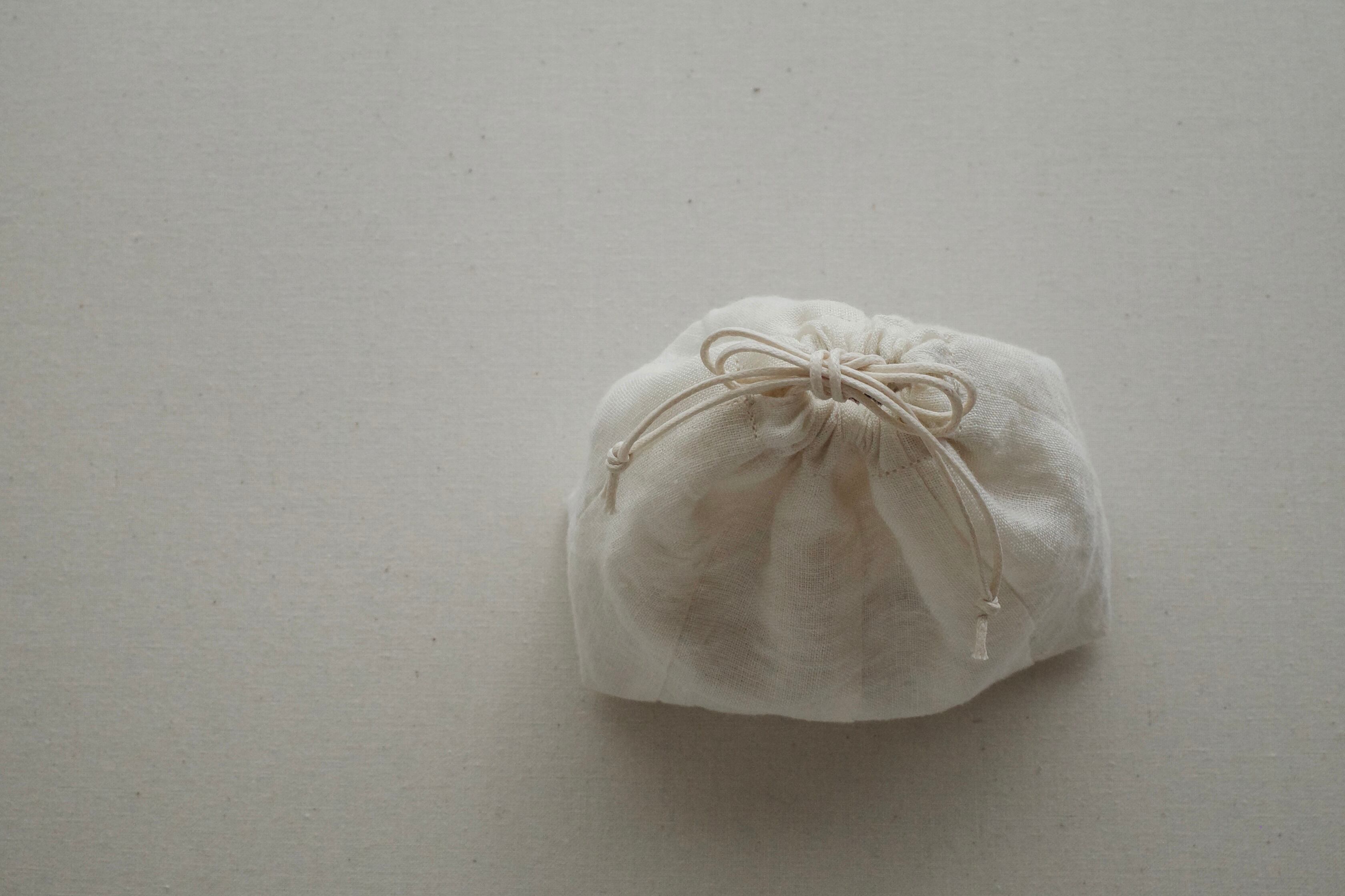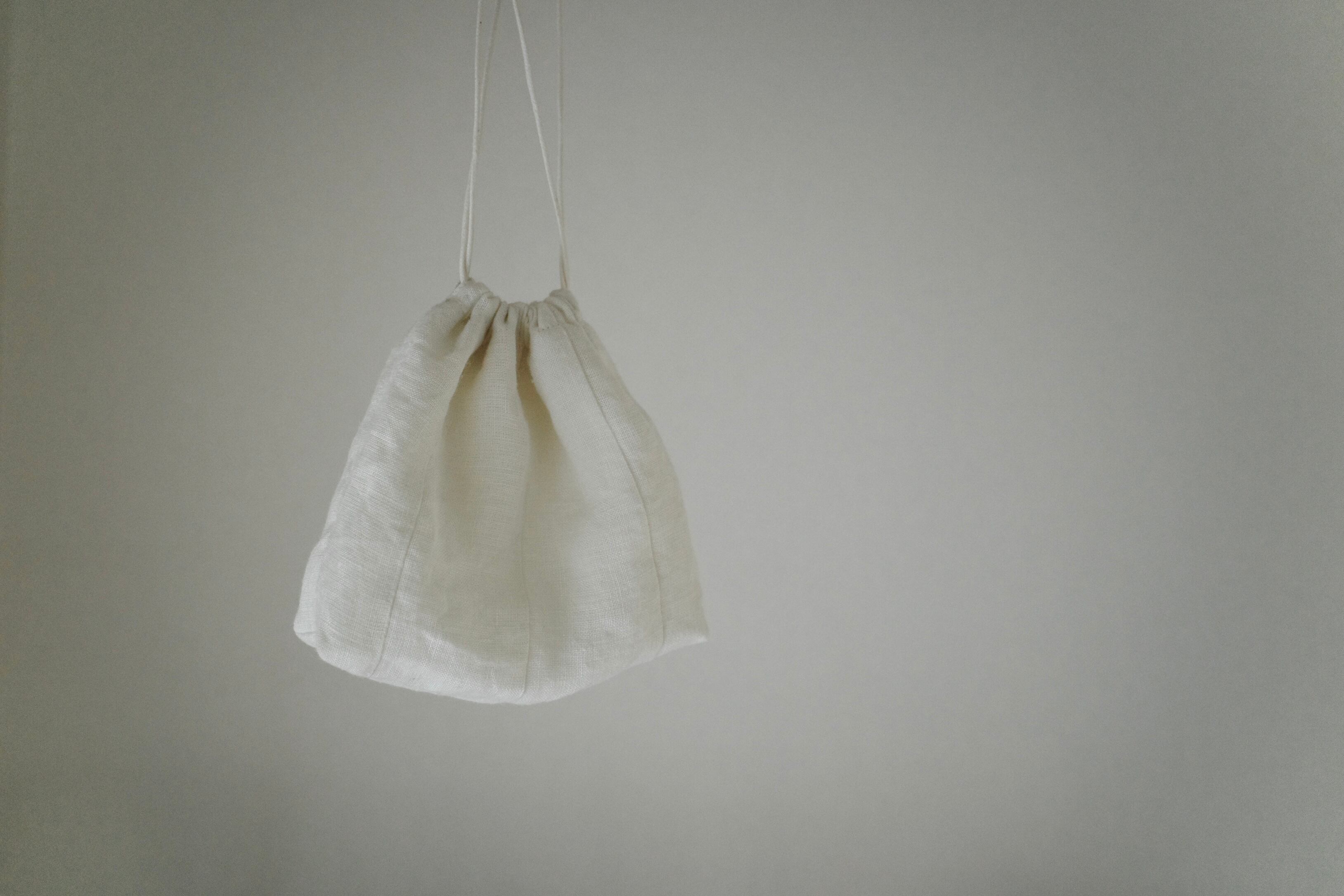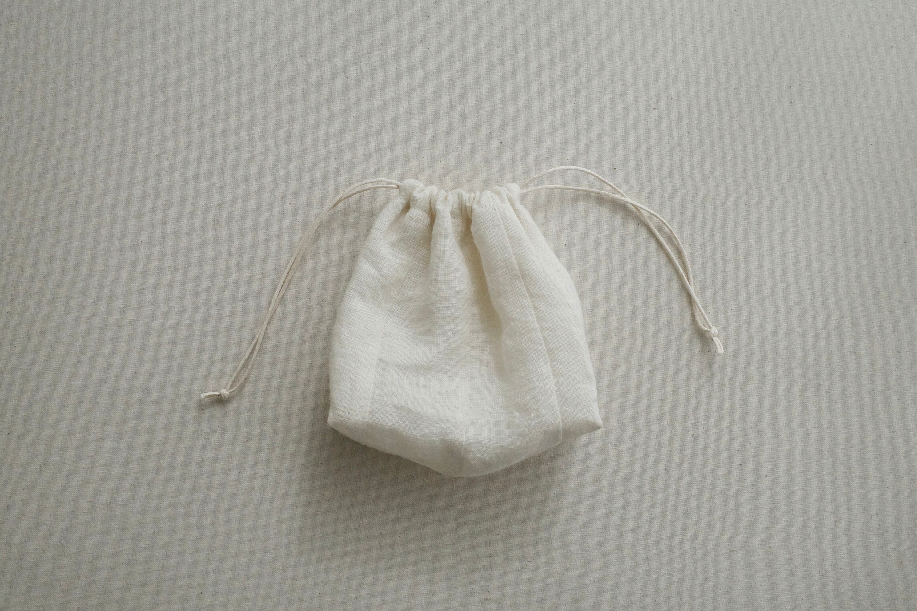 表布はリネンの生地、裏布と紐は綿の素材を使った二重の巾着です。