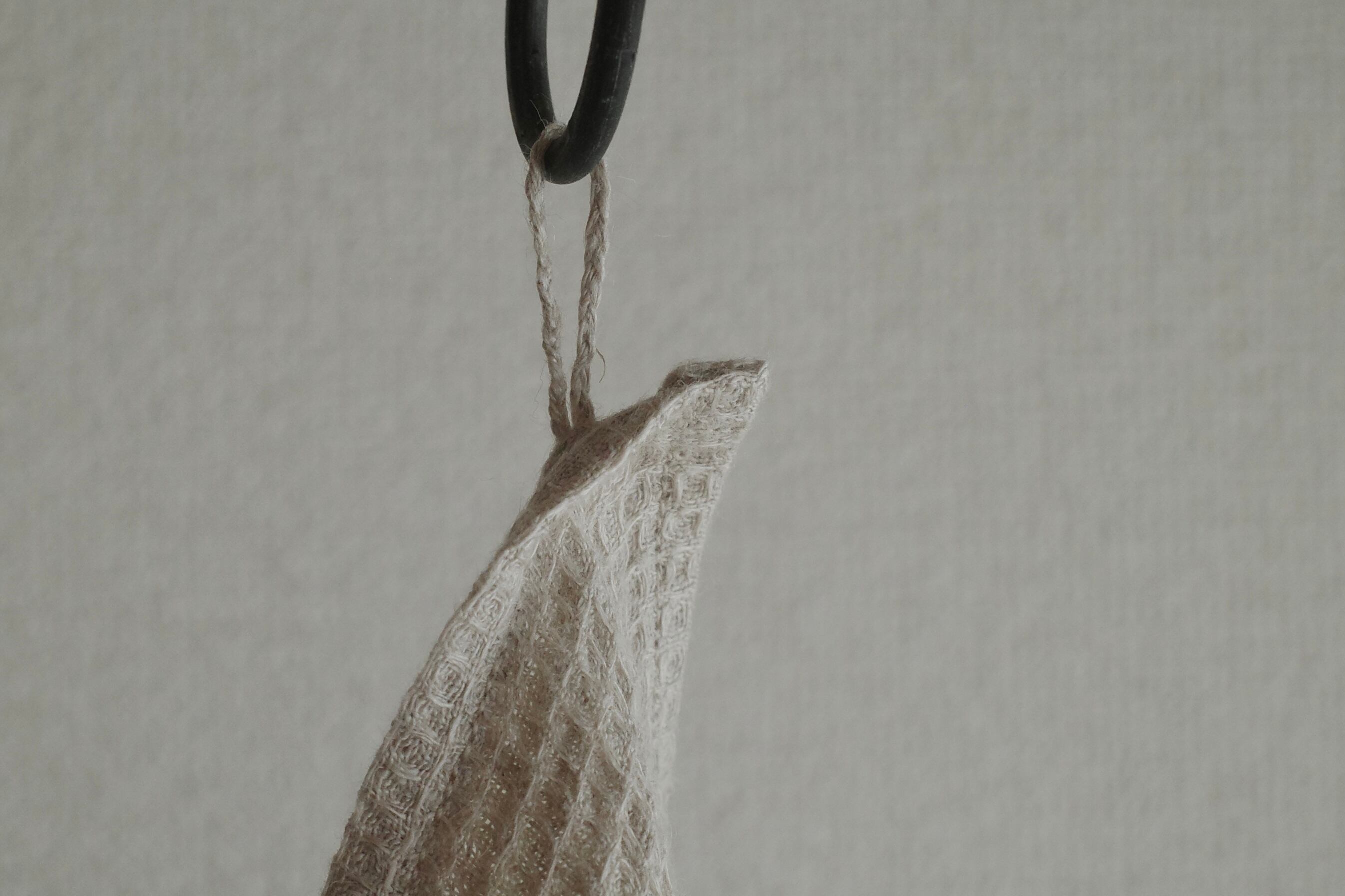 リネン糸を手編みした小さな引っ掛け紐が付いていて、掛けて使うことができます。